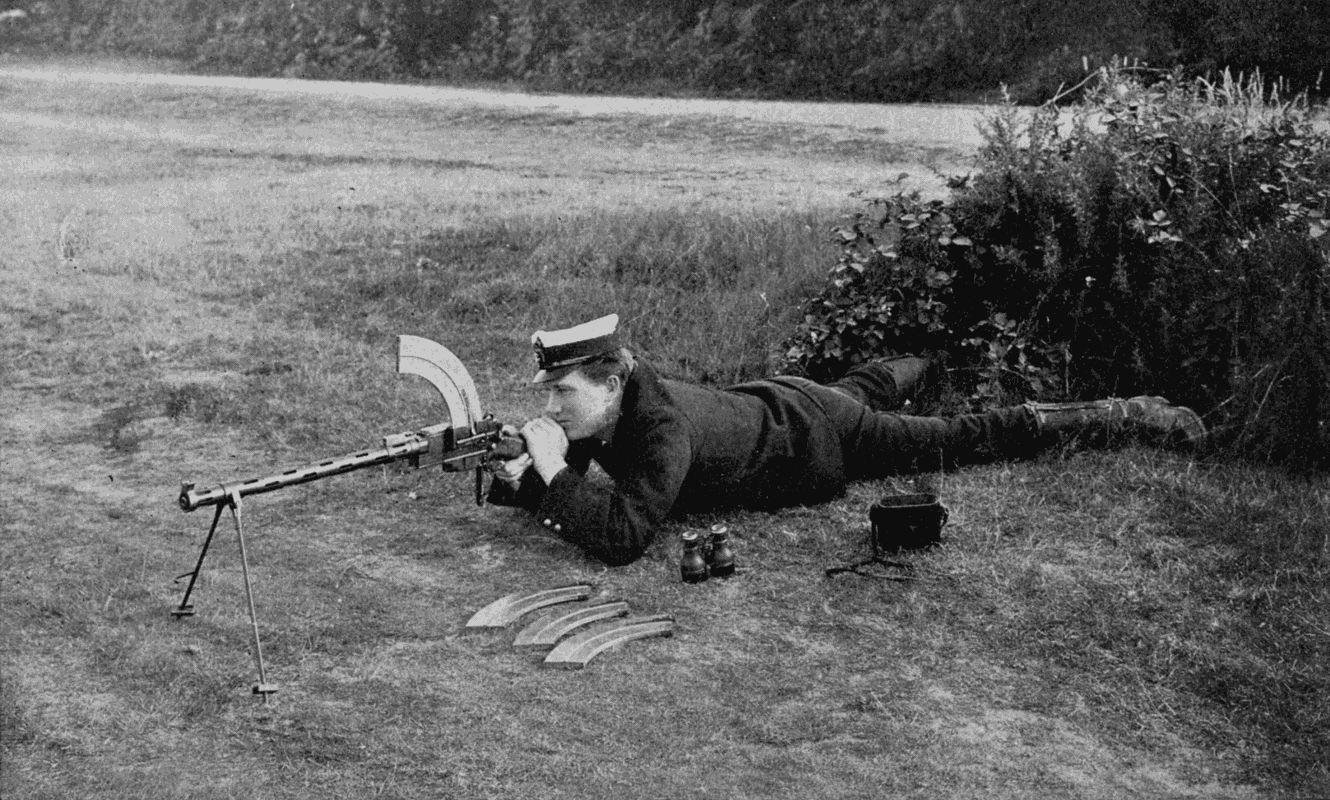 We may now watch a gunner at work. He chooses his position, opens out the supports, and pushes them into the ground so as to give the muzzle end a firm bearing. He then takes a magazine from the box he carries with him, and fixes it by a rapid motion into the magazine holder, then, resting his left hand on the stock to steady it, he pulls over the handle with his right so as to bring the barrel and all the moving mechanism into the backward position. He then releases the handle, and the recoil spring comes into action and drives the breech forward, when the controlling gear brings the front end of the breech-block into its downward position, admits the first cartridge into the breech and pushes it forward by the cartridge-feeder into the barrel chamber. The breech-block then rises to its central position at the back of the cartridge, and the gun is ready for firing.
